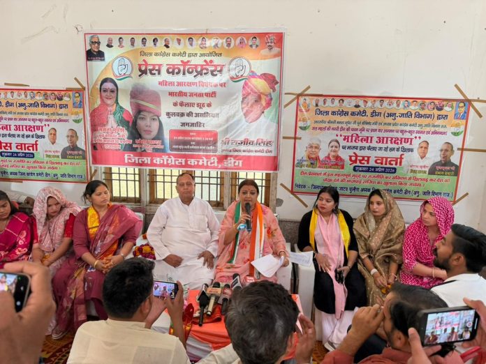 मनोज पाराशर तन्नू/कंट्री विजन/ डीग। जिला कांग्रेस कमेटी डीग द्वारा केंद्र सरकार पर महिला आरक्षण के बिल को लेकर जो जनता को भ्रमित किया जा रहा है उसको लेकर के डीग शहर के लाला वाला कुण्डा स्थित एक निजि मैरिज होम पर शुक्रवार को पूर्व कैबिनेट मंत्री ममता भूपेश के मुख्य आतिथ्य में प्रेस वार्ता आयोजित की गई।