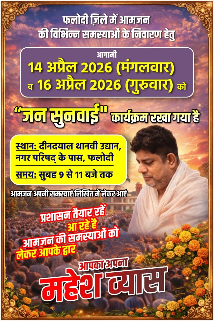 Homeताज़ा खबरफलोदी मै जन सुनवाई कार्यक्रम रखा गया फलोदी मै जन सुनवाई कार्यक्रम रखा गया By Wanted Samachar April 9, 2026 5 Share FacebookTwitterPinterestWhatsApp आज फलोदी मै नेता महेश व्यास ने आम जनता के लिए जनसुनवाई का कार्यक्रम के लिए 14 अप्रैल क़ो जन सुनवाई कार्यक्रम रखा गया Share FacebookTwitterPinterestWhatsApp Wanted Samacharhttps://wantedsamachar.com RELATED ARTICLES जयपुर अम्बानी का जन्मोत्सव विशेष अंदाज मै मनाया April 9, 2026 ताज़ा खबर न्यूटन उच्च माध्यमिक विद्यालय मै साइबर क्राइम की जानकारी डी April 9, 2026 ताज़ा खबर पत्नी की बेवफाई के चलते युवक ने की आत्महत्या May 14, 2025 LEAVE A REPLY Cancel reply Comment: Please enter your comment! Name:* Please enter your name here Email:* You have entered an incorrect email address! Please enter your email address here Website: Save my name, email, and website in this browser for the next time I comment. Most Popular अम्बानी का जन्मोत्सव विशेष अंदाज मै मनाया April 9, 2026 न्यूटन उच्च माध्यमिक विद्यालय मै साइबर क्राइम की जानकारी डी April 9, 2026 पत्नी की बेवफाई के चलते युवक ने की आत्महत्या May 14, 2025 मुख्यमंत्री योगी आदित्यनाथ ने दी बुद्ध पूर्णिमा की शुभकामनाएं May 12, 2025 Load more