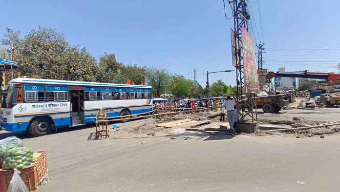 ब्यावर। शहर के सबसे व्यस्ततम ‘भगत चौराहे’ पर पिछले काफी समय से चल रहा नाले की खुदाई और निर्माण कार्य अब आमजन के लिए मुसीबत बन गया है। काम की गति धीमी होने के कारण चौराहे की सड़कें संकरी हो गई हैं, जिससे यहाँ दिनभर भारी यातायात का दबाव बना रहता है।